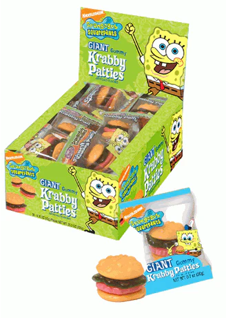 - Spongebob Giant chewy hamburger shaped gummy Krabby patty in original fruit flavor.